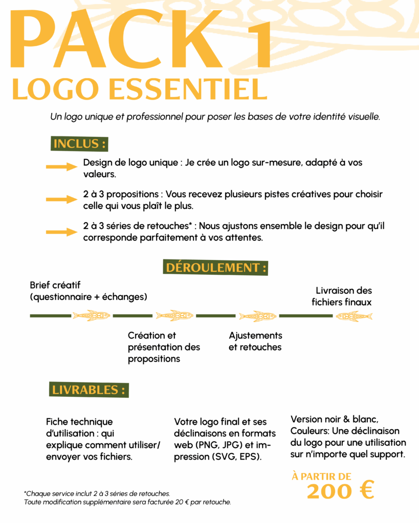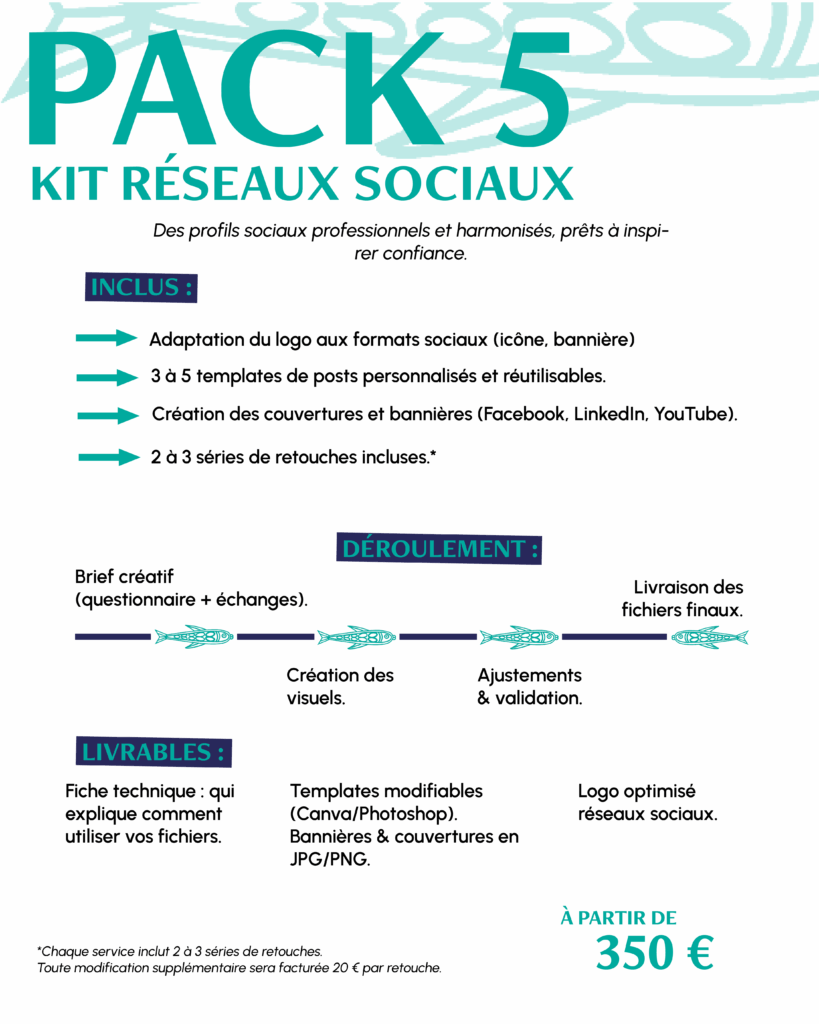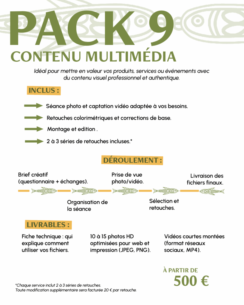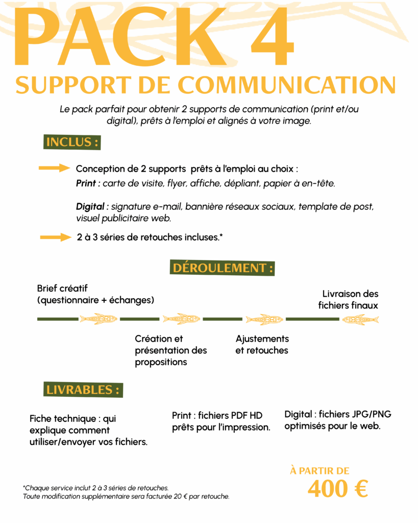 Découvrez mes packs clés en main et mes services à la carte. Des solutions adaptées à vos besoins en design graphique, webdesign, photo/vidéo et communication digitale. Tous mes packs incluent un accompagnement personnalisé et une fiche technique pour utiliser facilement vos fichiers.